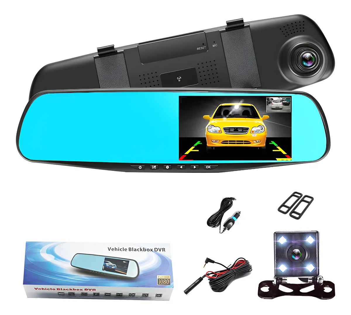 Convierte tu auto en un vehículo más seguro e inteligente con este espejo retrovisor digital con cámara frontal y cámara trasera incluida, ideal para grabar tu camino y facilitar maniobras al estacionarte.