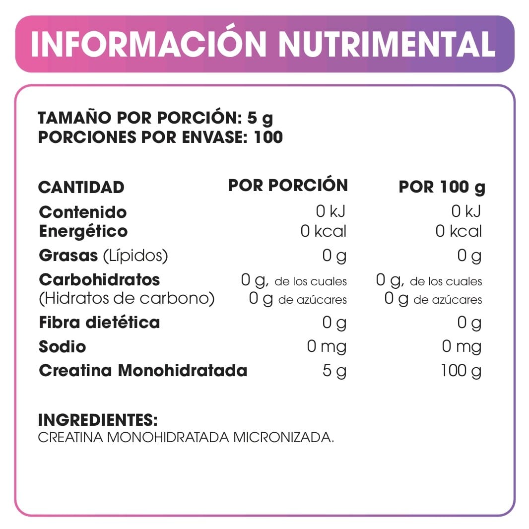Presentación: Frasco con 500g de Creatina Monohidratada (100 servicios)