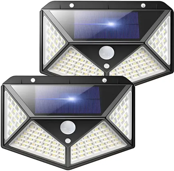 2 lámparas solares para exteriores, 100 LED, lámpara solar superbrillante para exteriores, 800 lúmenes, 3 modos, lámpara solar de pared, lámpara solar impermeable para exteriores para jardín