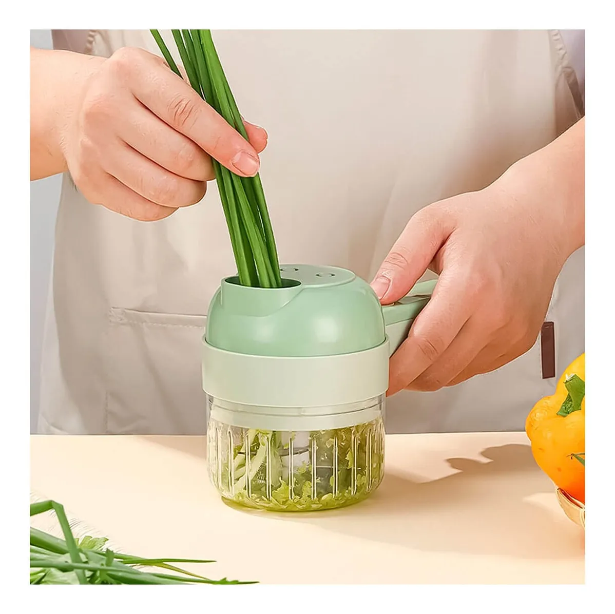 Con este procesador eléctrico, puedes cambiar fácilmente entre un cortador de verduras y una picadora de carne, gracias a los accesorios multifuncionales incluidos. Ideal para cortar verduras frescas directamente en el recipiente, ya que permite añadir mezclas o especias de forma práctica. Adecuado para triturar una variedad de verduras y condimentos como cebolla, ajo, chile, perejil, comino, jengibre y otros.
